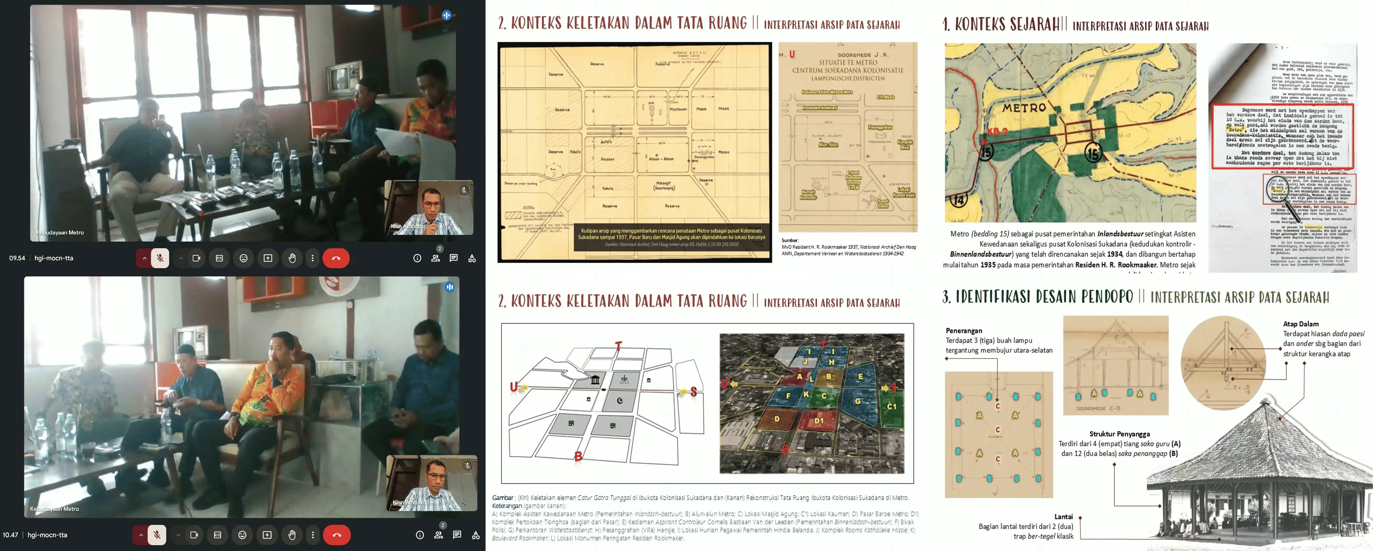 Rapat koordinasi dilakukan pada Kamis, 3 Oktober 2024 secara hybrid luring dan daring. Kian Amboro yang dalam kesempatan tersebut berperan sebagai akademisi/sejarawan membidangi penyiapan data-data historis berkenaan dengan objek Pendopo Asisten Wedana Metro yang akan dibangun kembali. Dalam paparannya, Kian menyampaikan perihal konteks sejarah Metro sebagai ruang yang sejak awal memang direncanakan sebagai sebuah kota oleh kolonial Belanda, dengan mengadopsi pola kota tradisional Jawa yaitu Catur Gatra Tunggal yang berakar sejak zaman Majapahit. Ia mengungkapkan, bahwa hal itu yang membedakan tata ruang di Kota Metro begitu khas dan sangat berbeda dengan 50 lokus kolonisasi penduduk Jawa lainnya di Lampung. Dimana yang lainnya hanya direncanakan sebagai pemukiman atau desa tempat tinggal kolonis saja.