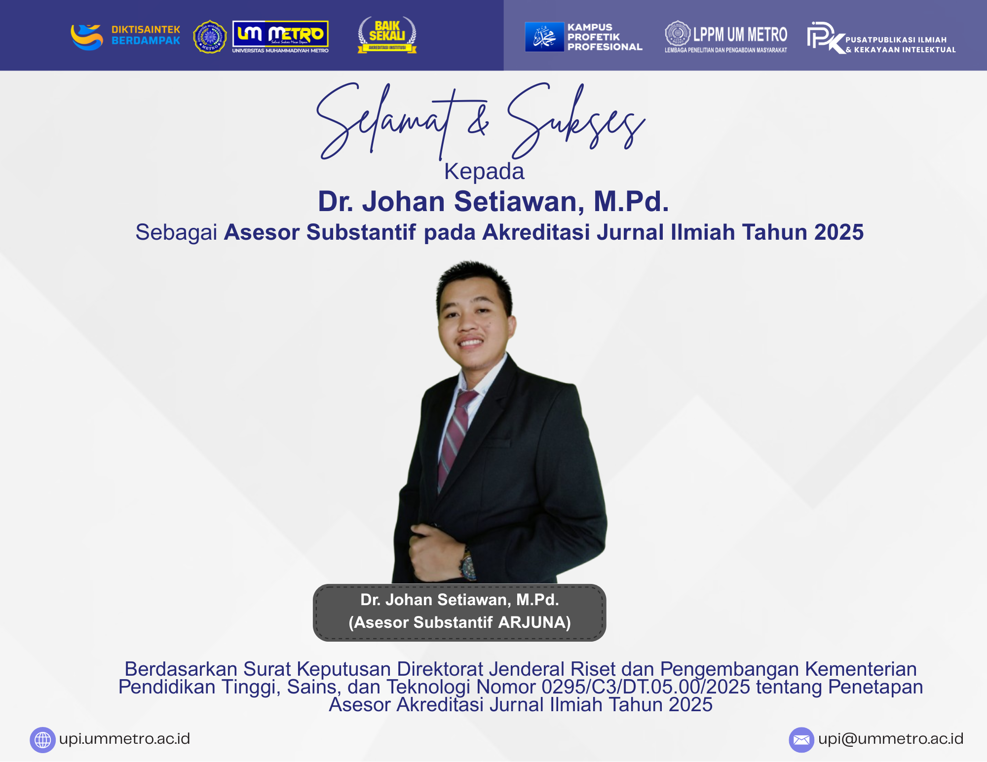 Prodi Pendidikan Sejarah FKIP Universitas Muhammadiyah Metro kembali menorehkan prestasi membanggakan di tingkat nasional. Salah satu dosen terbaiknya, Dr. Johan Setiawan, M.Pd., ditetapkan sebagai Asesor Substantif pada Akreditasi Jurnal Ilmiah Tahun 2025 berdasarkan Surat Keputusan Direktorat Jenderal Riset dan Pengembangan Kementerian Pendidikan Tinggi, Sains, dan Teknologi Nomor 0295/C3/DT.05.00/2025.
