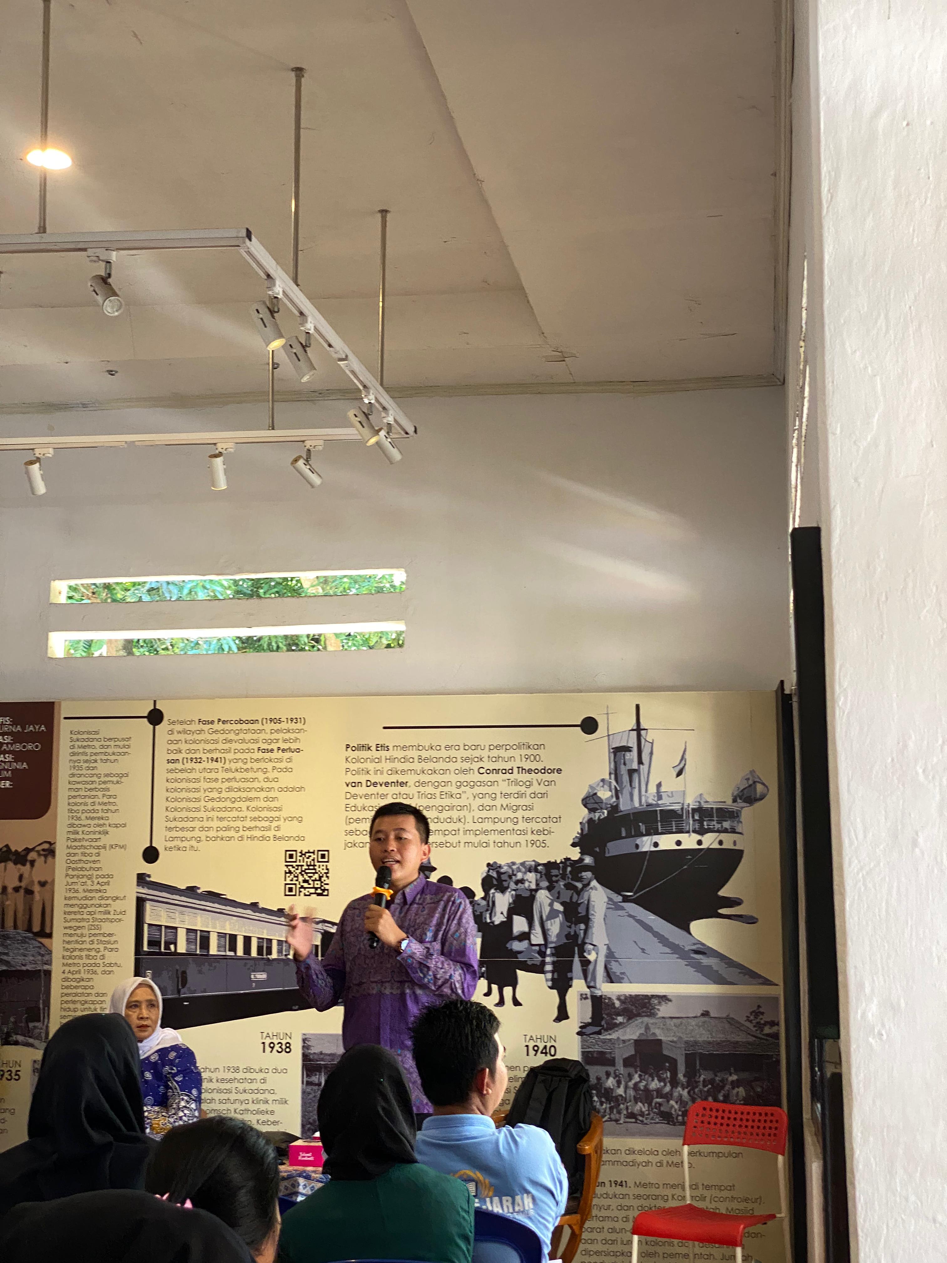Metro, 06/10/2025 - Program Studi Pendidikan Sejarah UM Metro melakukan Kegiatan Pelatihan Tour Guide (Workshop Tour Guide/LokaKarya Pencapaian profil Lulusan Mahasiswa) pada hari Sabtu, 4 Oktober 2025. Kegiatan ini di ikuti oleh 40 orang peserta dari Mahasiswa Pendidikan Sejarah. Acara ini dilaksnakan di hari Sabtu, 4 Oktober 2025 dengan menghadirkan pemateri dari Kaprodi Pendidikan Sejarah Bapak Dr. Johan Setiawan, M.Pd, Kabid Dinas Pendidikan dan Kebudayaan Kota Metro Ibu Siti Rogayati Seprita, S.Pd., MM dan dari Komunitas Metro Walkingtour Dimas Setiawan, S.Pd.